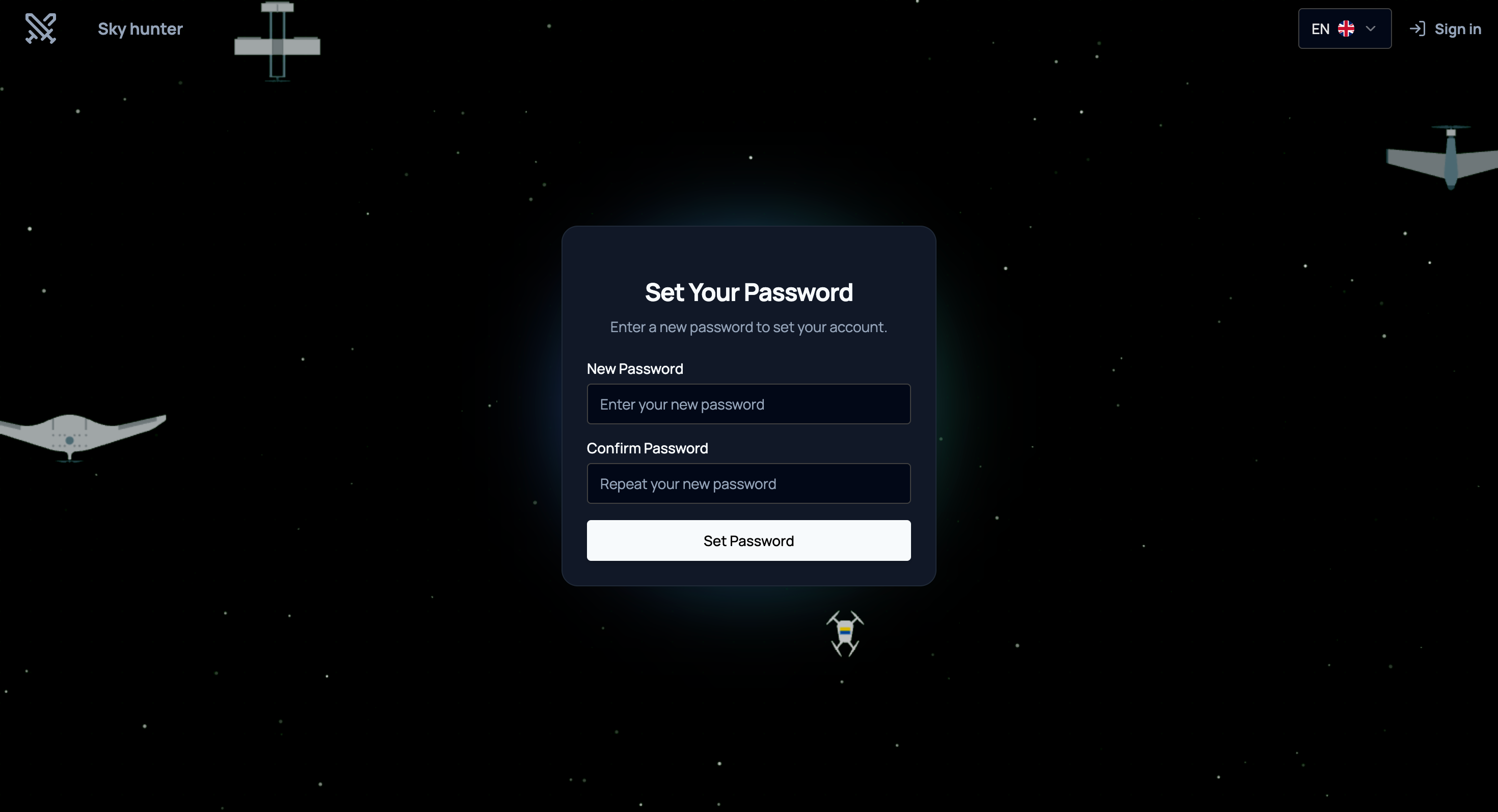На поточний момент система SkyHunter не передбачає вільну реєстрацію. Для того, щоб стати користувачем системи, необхідно отримати персональне запрошення на електронну пошту. Запрошення надсилається адміністратором або відповідальною особою вашого підрозділу.