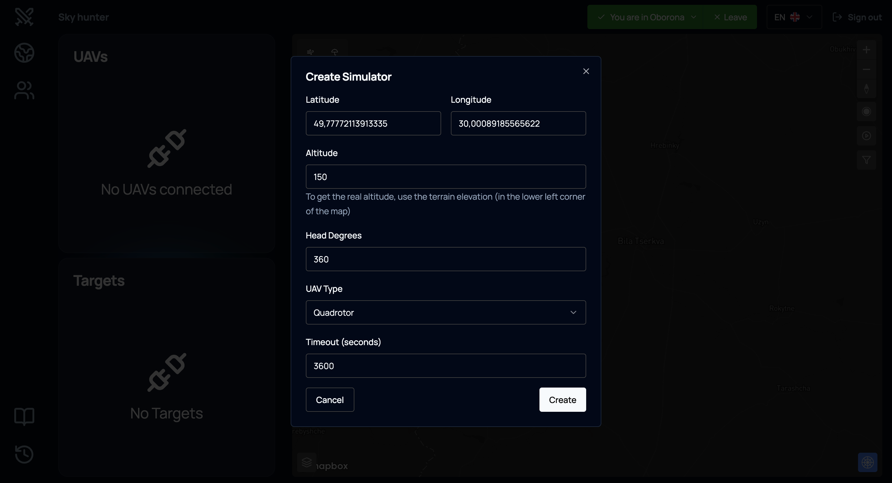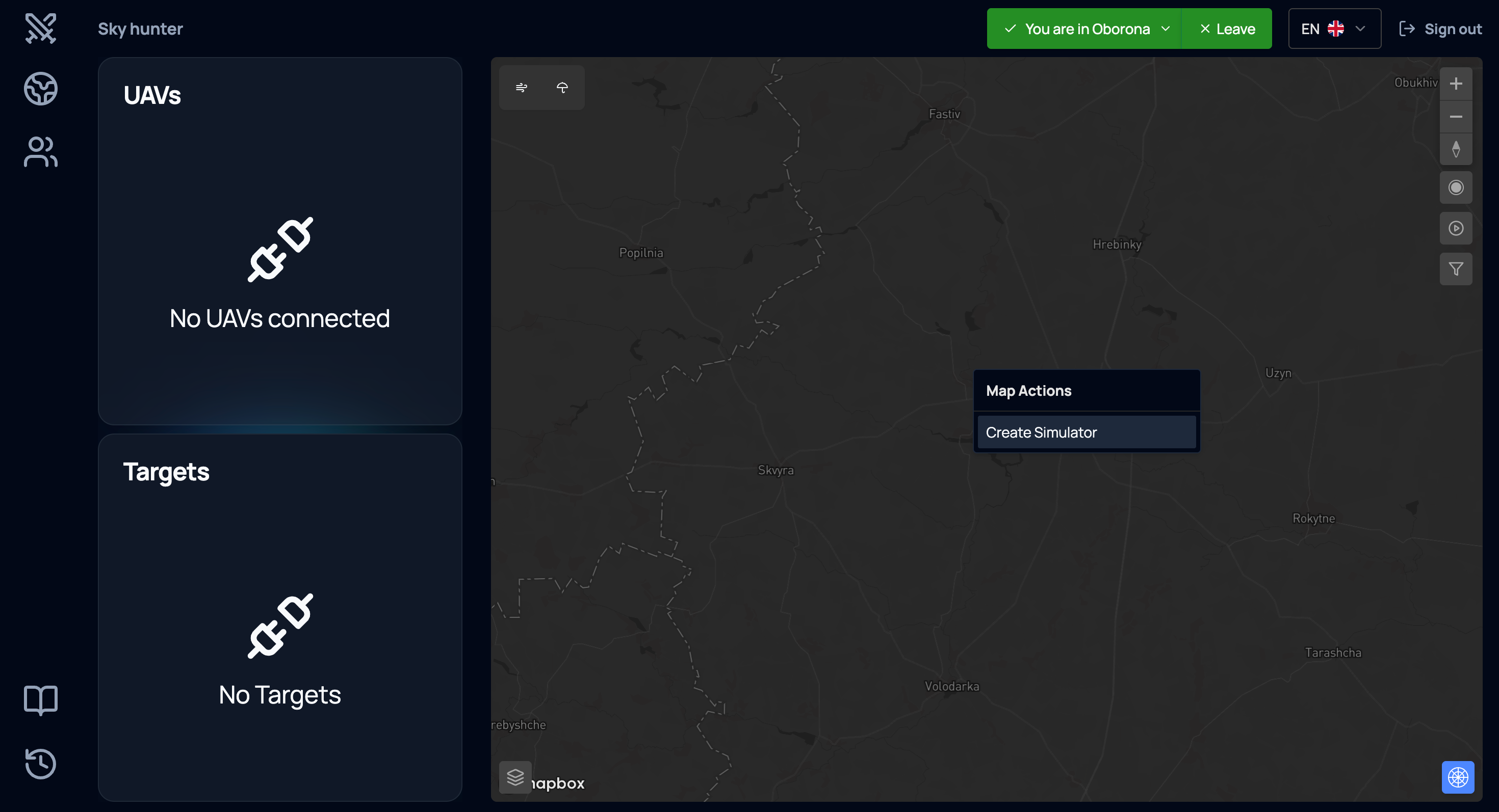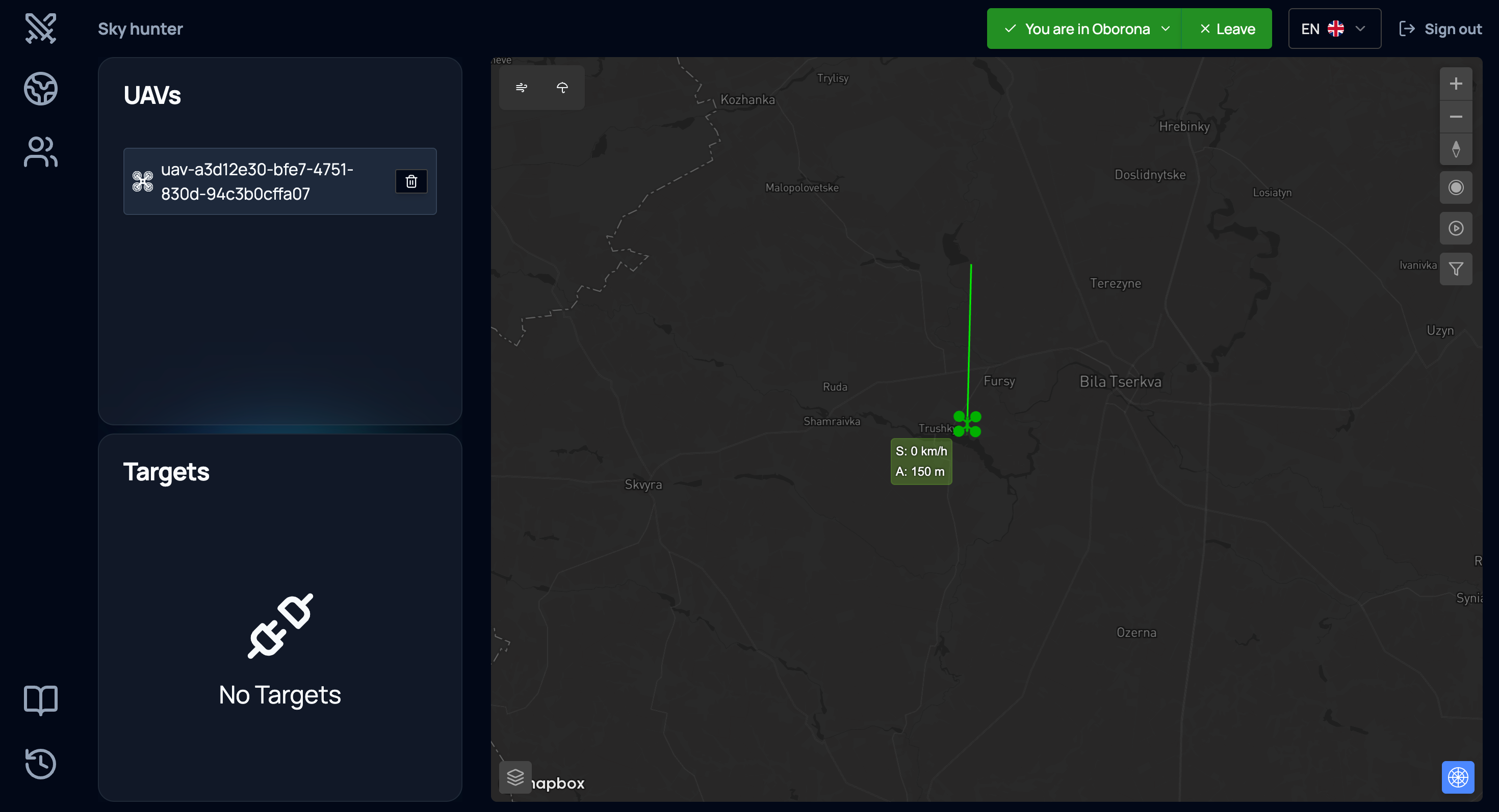 Через 1–3 хвилини (час ініціалізації сервісів та синхронізації даних) на мапі з’являється зелена іконка обраного типу симулятора – це активований симульований БПЛА.