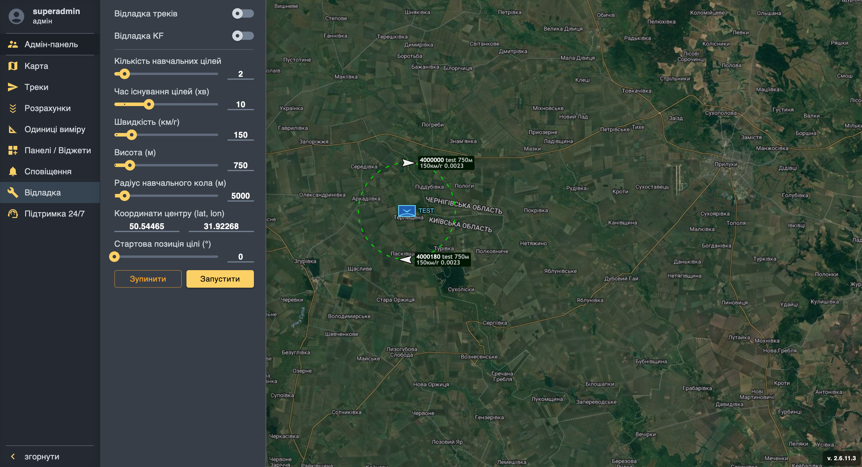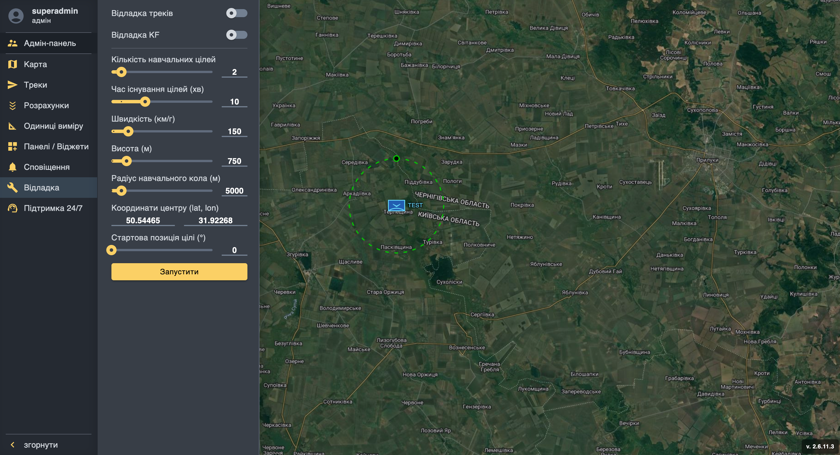 Натискаємо на значок шестерні, обираємо пункт меню Відладка. У відкритому вікні налаштувань можна залишити параметри за замовчуванням. Необхідно змінити лише координати (вставляємо ті, що були скопійовані раніше з маркеру на мапі) та вказати кількість навчальних цілей. Після цього натискаємо Запустити.